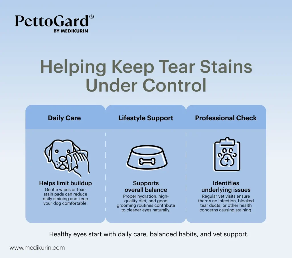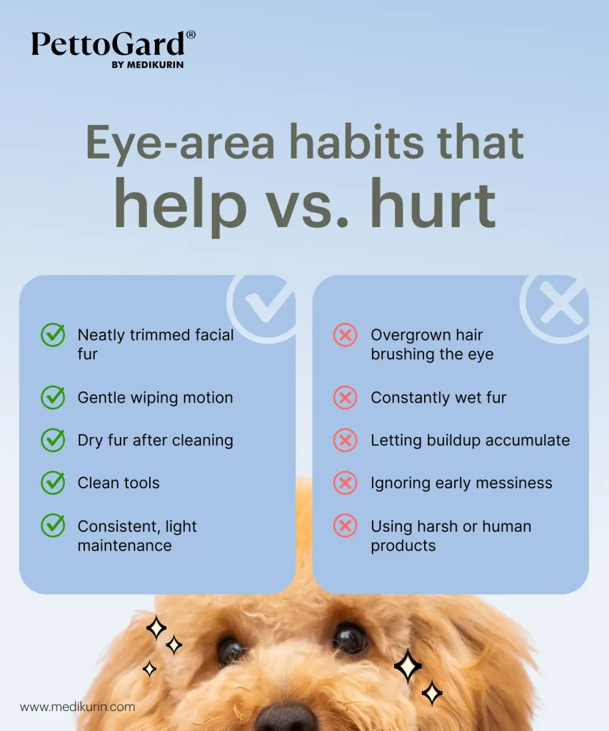 If you’re using a grooming product, choose one that is formulated for the delicate eye area, non-irritating, and safe even if accidentally licked, such as PettoGard Antimicrobial Skin Care & Wound Spray for Dogs. Regular trimming of long facial hair also helps reduce tear retention and moisture buildup. For more details and tips, read our pet grooming article here.